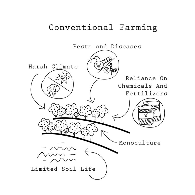 Most coffee gets produced in large monocultures with very little biodiversity. There is no shelter and exposure to the elements makes coffee plants more susceptible to stress, pests and disease. Insects and other biodiversity cannot find a home, so pest and soil management is done by chemicals instead.