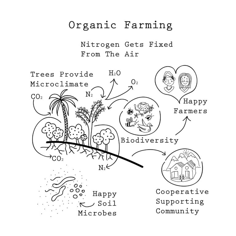 The farmers in Nepal grow coffee as part of a mixed permaculture system. Banana trees and nitrogen fixing trees provide shade, fruit, fertilizers, organic matter and prevent erosion. Food crops like corn, cassava, beans and peppers grow at the ground level. Animals process organic waste, completing the balanced closed loop nutrient cycle integral to organic farming. A high variety of plants helps support biodiversity, and this allows soil microbes, worms, insects, birds and mammals in return to prevent pest and disease.